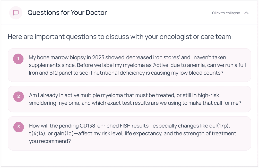Your report generates evidence-based questions tailored to your diagnosis and treatment plan, helping you have clearer, more productive conversations during appointments.