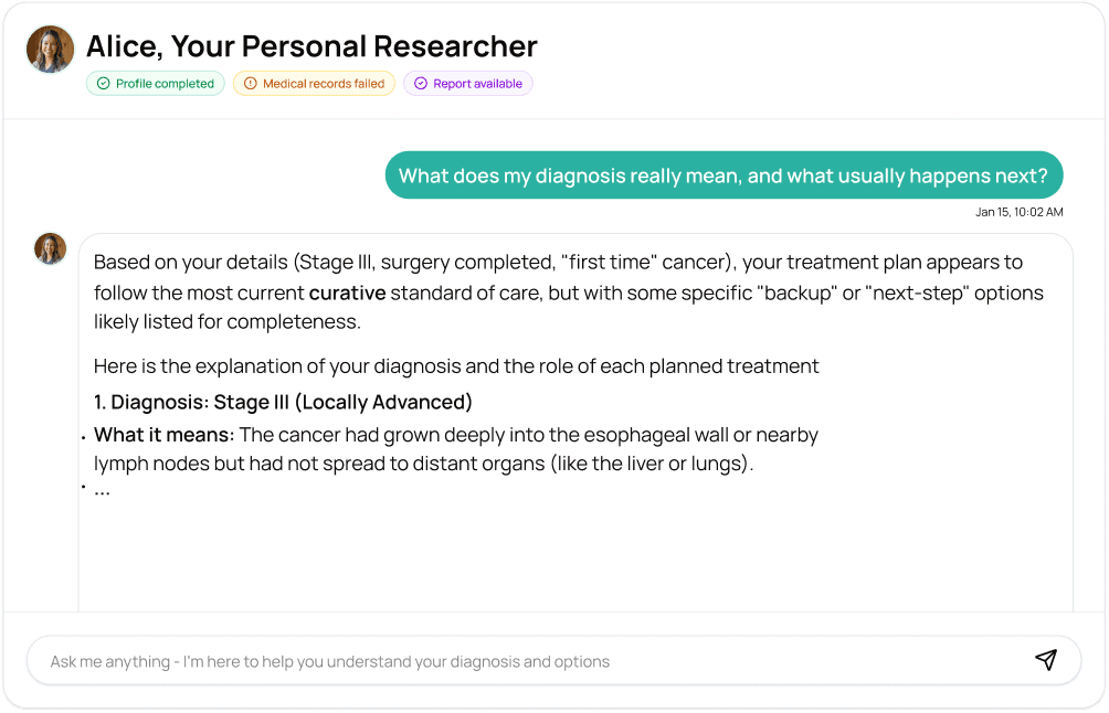 Radical explains the science behind your diagnosis, biomarkers, imaging, and treatment options. Summarizing the research and guidelines so you don’t have to decode medical papers alone.