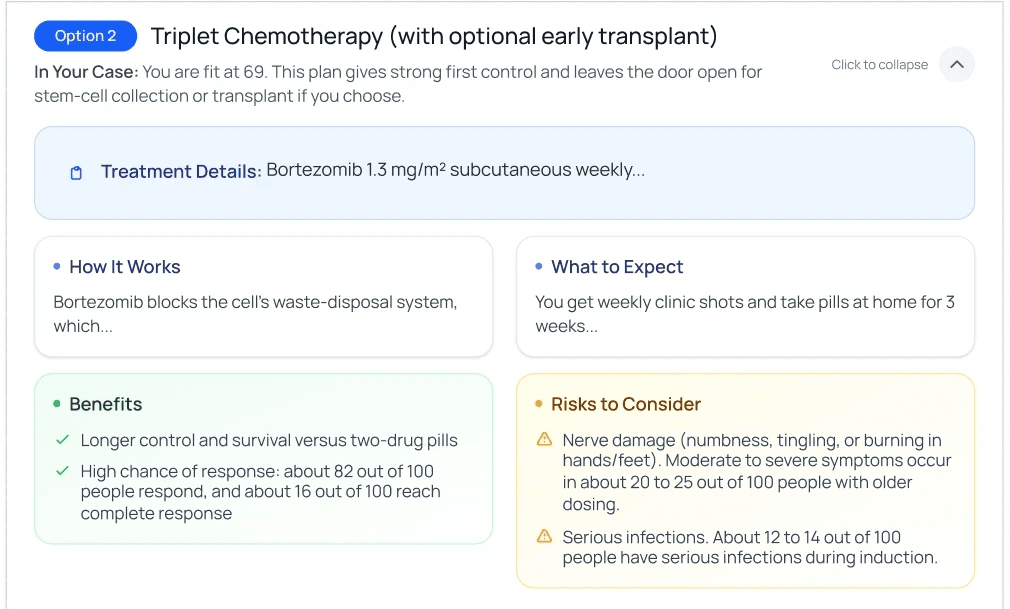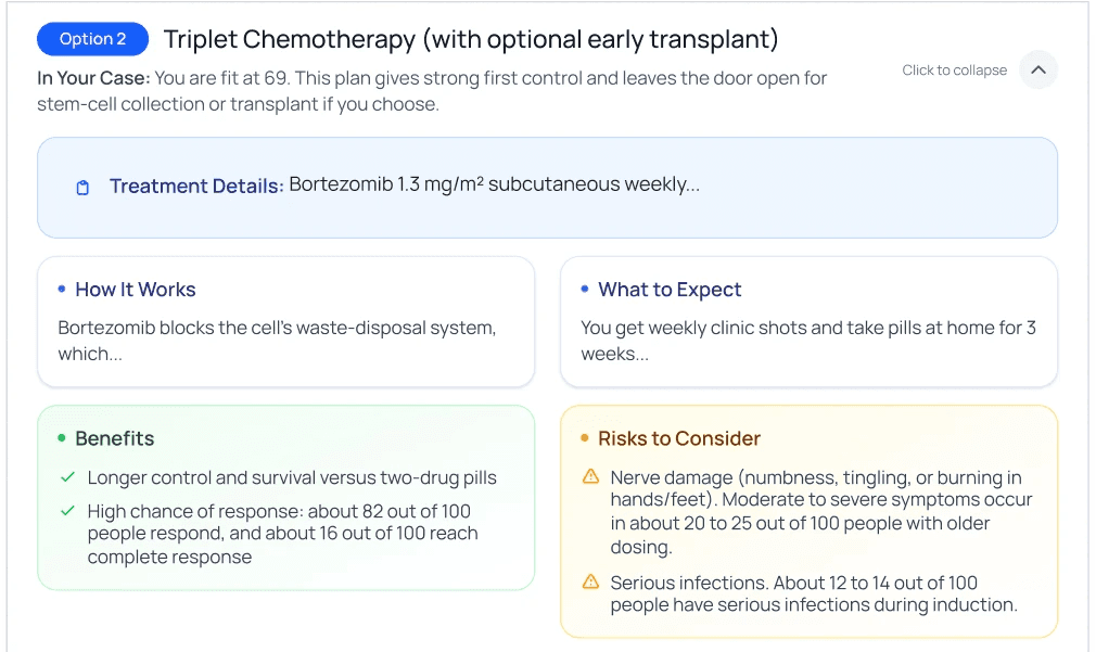 Our system first understands your entire medical history from what you tell us, your clinical notes, radiology and pathology reports, lab results, and genetic data. Then, it synthesizes this with insights from the latest expert medical knowledge and literature, and over 10 million anonymized patient journeys to provide you with a personalized report. Meticulous software and human expert oncologist checks ensure that our reports are clinically accurate and relevant to you.